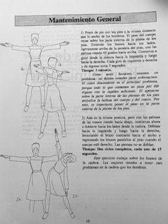 - Realizar el ejercicio 2 veces. Empezamos con el lado izquierdo y volvemos y lo repetimos otra vez. Los brazos quedan paralelos al pasar por el centro y perpendiculares en los extremos de cada lado.Los hombros están relajados. El movimiento sale de la cadera y es lento, tardando 15 segundos en llegar del extremo izquierdo al derecho.