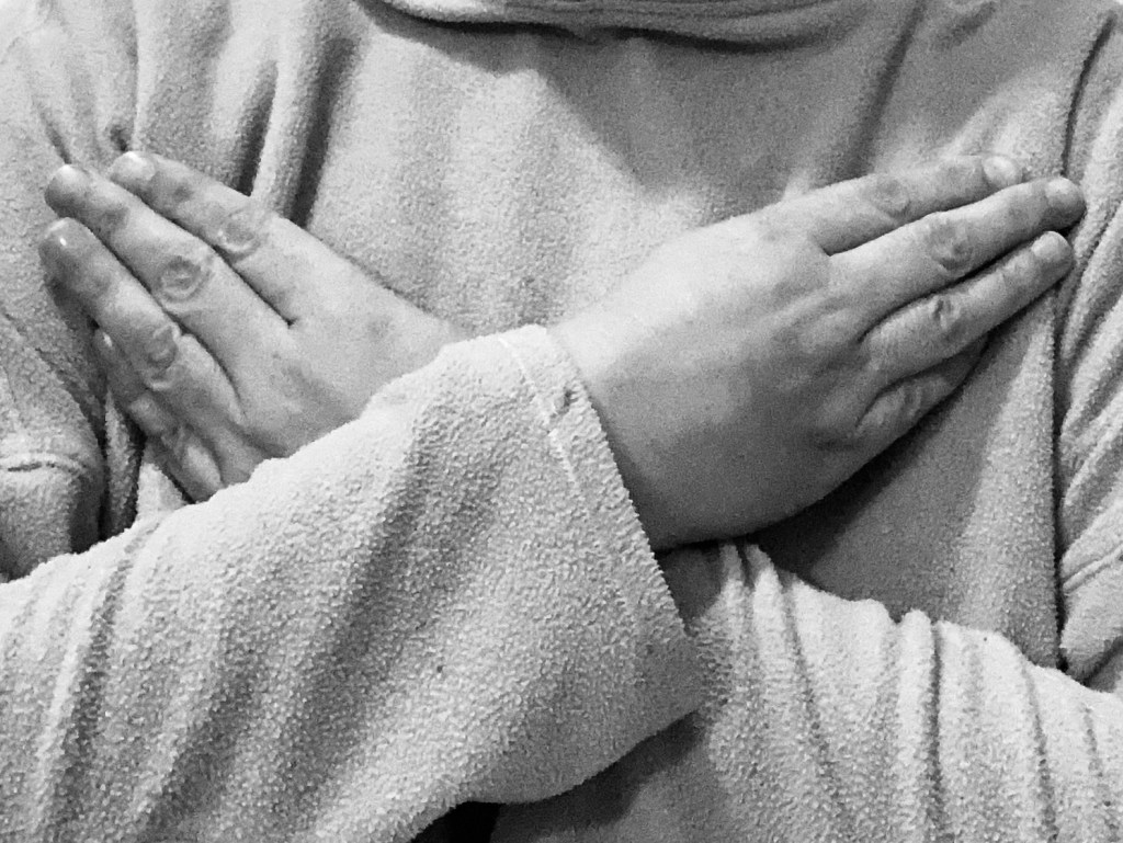 Empezamos y acabamos cada frase con las manos en el pecho.